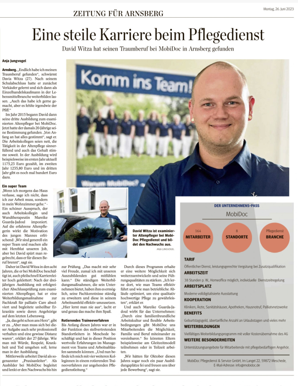 Unser Mitarbeiter David berichtet über seine tolle Karriere bei MobiDoc in der Westfalenpost vom 26.06.2023: "Endlich habe ich meinen Traumberuf gefunden. Wenn ich morgens das Haus verlasse, sage ich nicht, dass ich zur Arbeit muss, sondern in mein Wohnzimmer gehe."
